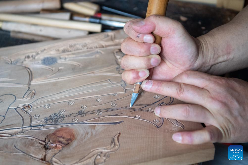 Xu Jiahui, a representative inheritor of Liangping New Year Woodblock Prints, demonstrates the engraving process to students at his workshop in Liangping District of southwest China's Chongqing Municipality, Aug. 10, 2025. Hanging New Year pictures is one of the folk activities for Chinese people to celebrate the Spring Festival. A summer vacation experience class of Liangping New Year Woodblock Prints, a national intangible cultural heritage item, opened here on Sunday. (Xinhua/Tang Yi)