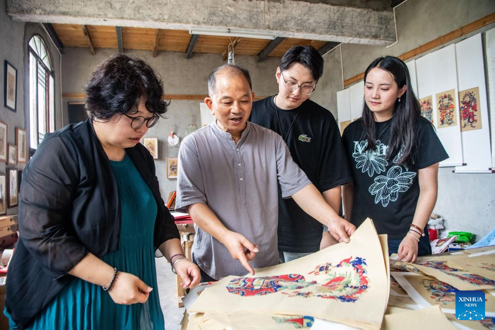 Xu Jiahui (2nd L), a representative inheritor of Liangping New Year Woodblock Prints, introduces this craft to students at his workshop in Liangping District of southwest China's Chongqing Municipality, Aug. 10, 2025. Hanging New Year pictures is one of the folk activities for Chinese people to celebrate the Spring Festival. A summer vacation experience class of Liangping New Year Woodblock Prints, a national intangible cultural heritage item, opened here on Sunday. (Xinhua/Tang Yi)