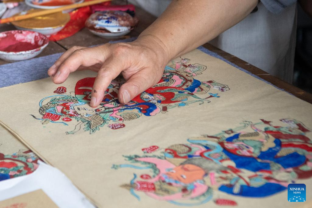 Xu Jiahui, a representative inheritor of Liangping New Year Woodblock Prints, executes the facial rendering process of a woodblock painting at his workshop in Liangping District of southwest China's Chongqing Municipality, Aug. 10, 2025. Hanging New Year pictures is one of the folk activities for Chinese people to celebrate the Spring Festival. A summer vacation experience class of Liangping New Year Woodblock Prints, a national intangible cultural heritage item, opened here on Sunday. (Xinhua/Tang Yi)
