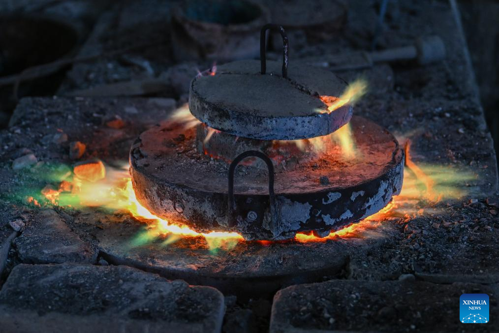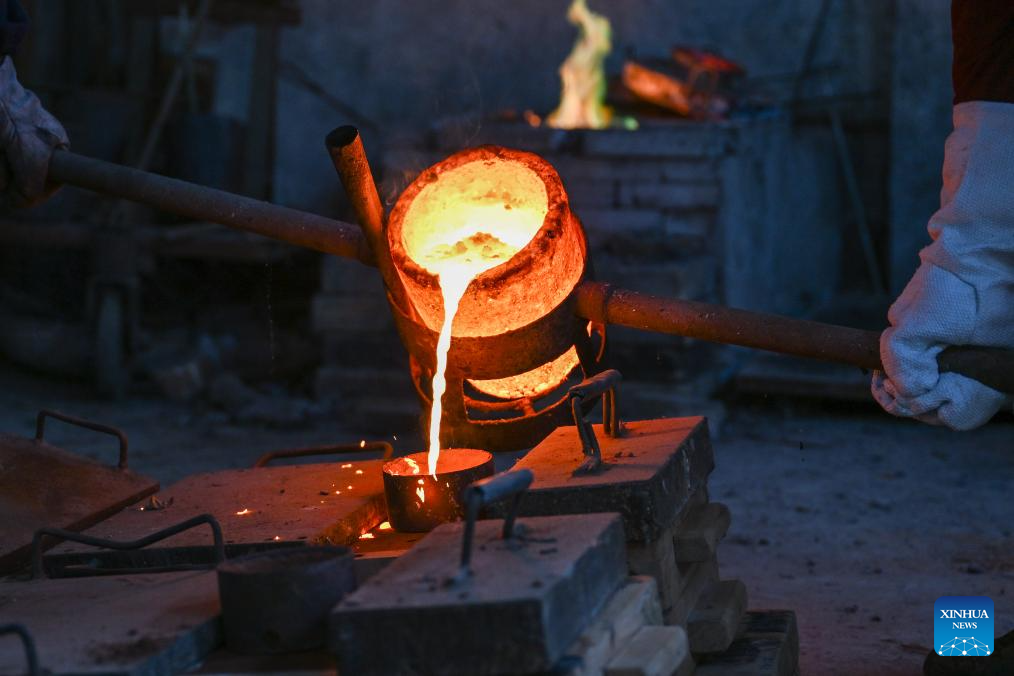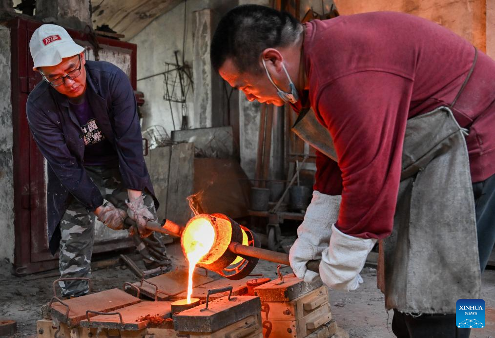 Ao Xinghua and his brother Ao Xingqiang pour molten copper into a mould at Ao's family workshop in Buhe Town of Jingzhou City, central China's Hubei Province, June 17, 2025.