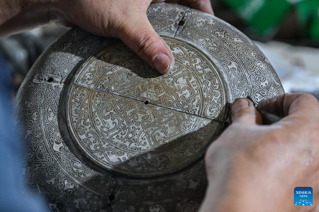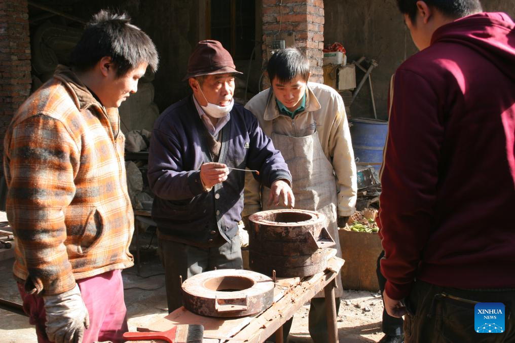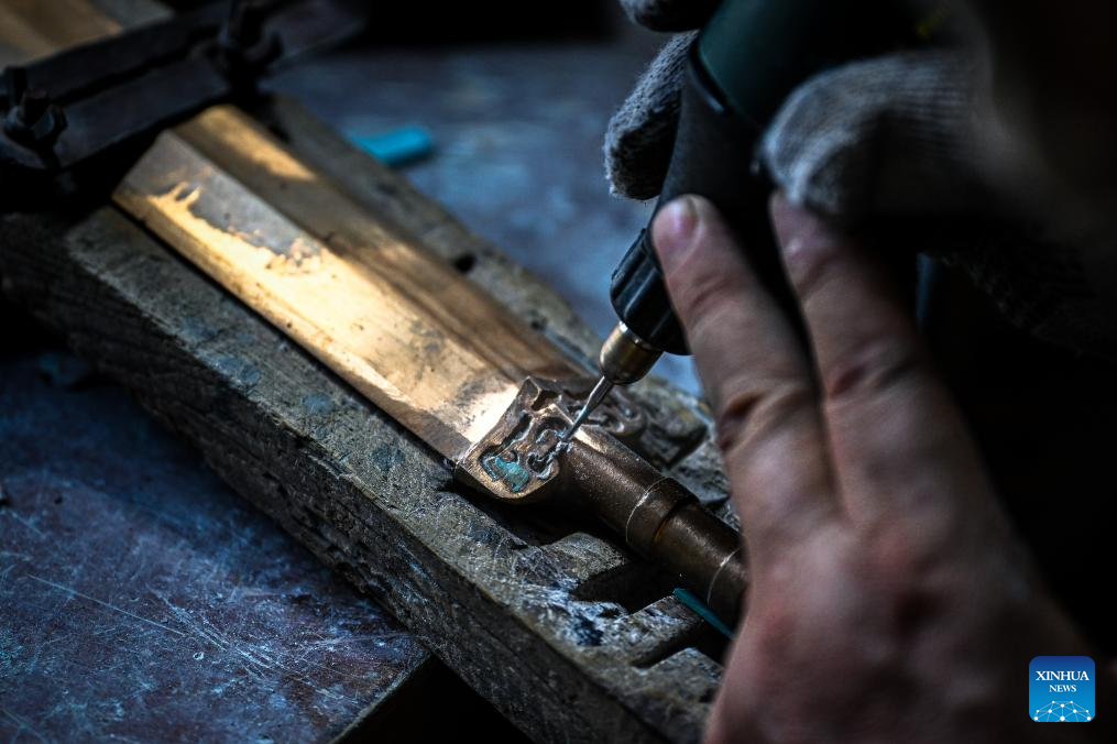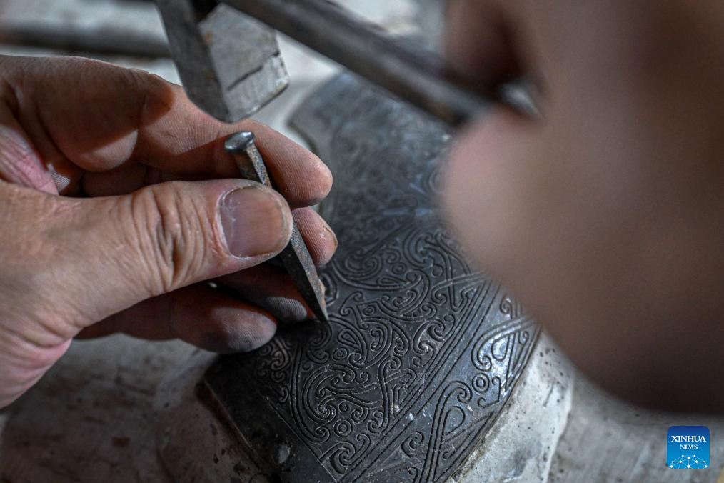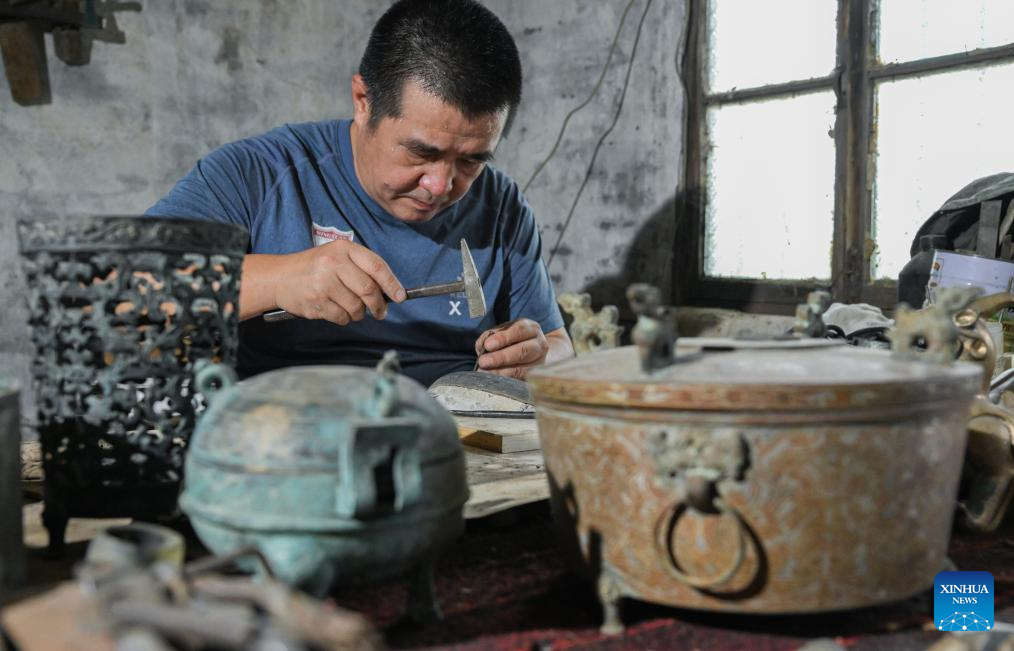 Except for selling bronze ware artworks according to orders, their workshop today also cooperates with museums to repair and replicate cultural relics. Moreover, they also take part in important exhibitions and open classes on campus. "Making bronze wares is never an easy work, " said Ao Xinghua, "In hot summer, we have to stand for 10 hours beside the copper melting furnace which has a temperature of 1,200 to 1,600 degrees Celsius. " Due to its complicated making procedures, long production cycle, few learners and niche market, the craft of Lead-Tin Engraving is now facing great difficulty to develop and pass down. "Maybe one day we can only see bronze wares in showcases of museums, " said Ao Xinghua, "and the future of the art depends on whether the younger generations see its values." (Xinhua/Du Zixuan)