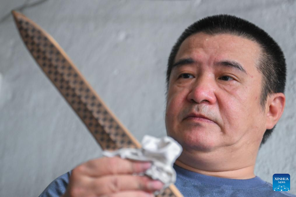 Ao Xinghua wipes a finished lead-tin engraving artwork at Ao's family workshop in Buhe Town of Jingzhou City, central China's Hubei Province, June 24, 2025.