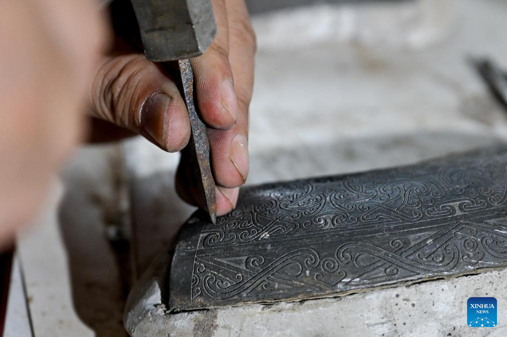 Ao Xinghua engraves on a piece of lead-tin alloy at Ao's family workshop in Buhe Town of Jingzhou City, central China's Hubei Province, June 16, 2025.