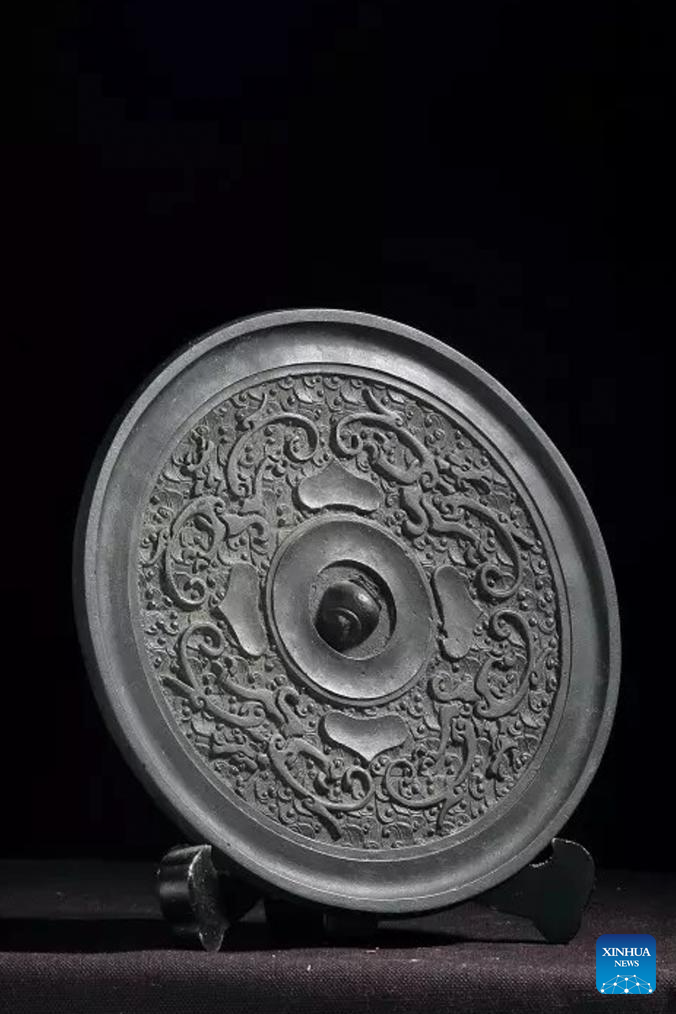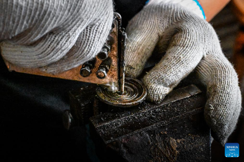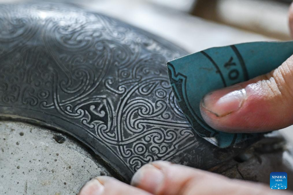 Ao Xinghua grinds a piece of patterned lead-tin alloy at Ao's family workshop in Buhe Town of Jingzhou City, central China's Hubei Province, June 24, 2025.