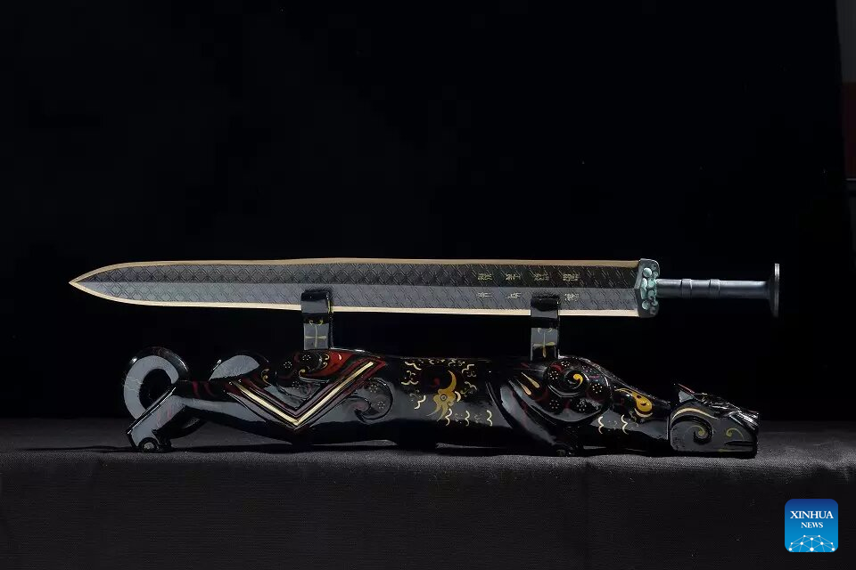 Ao Xinghua inlays turquoise into the handguard of a sword at Ao's family workshop in Buhe Town of Jingzhou City, central China's Hubei Province, June 16, 2025.
