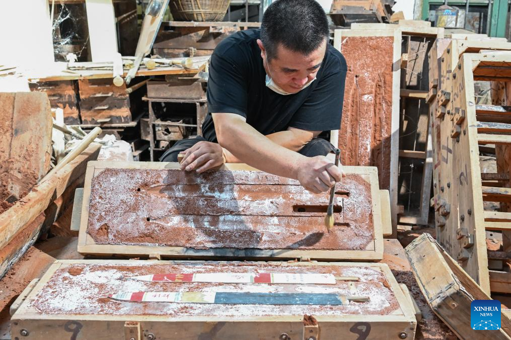Ao Xinghua makes a mould at Ao's family workshop in Buhe Town of Jingzhou City, central China's Hubei Province, June 16, 2025.
