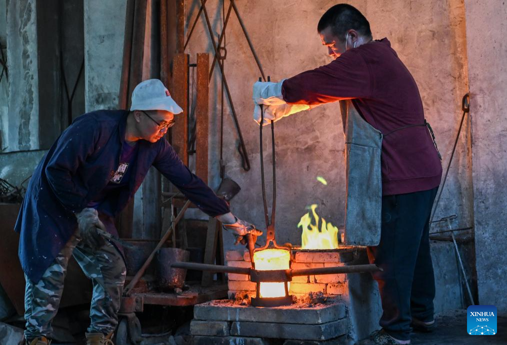 Ao Xinghua (R) and his brother Ao Xingqiang pour molten copper into a mould at Ao's family workshop in Buhe Town of Jingzhou City, central China's Hubei Province, June 17, 2025.