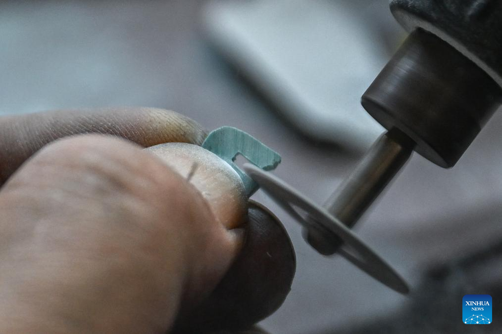 Ao Xinghua grinds an inlaid part at Ao's family workshop in Buhe Town of Jingzhou City, central China's Hubei Province, June 16, 2025.