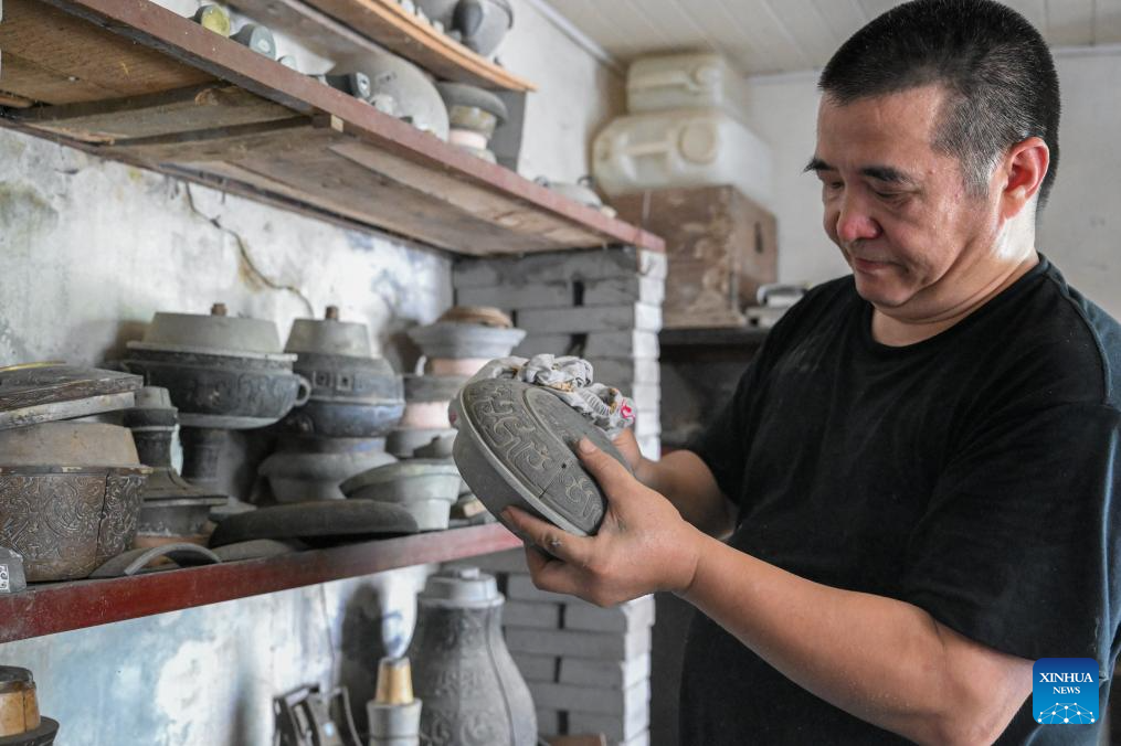 Ao Xinghua cleans a mould at Ao's family workshop in Buhe Town of Jingzhou City, central China's Hubei Province, June 16, 2025.