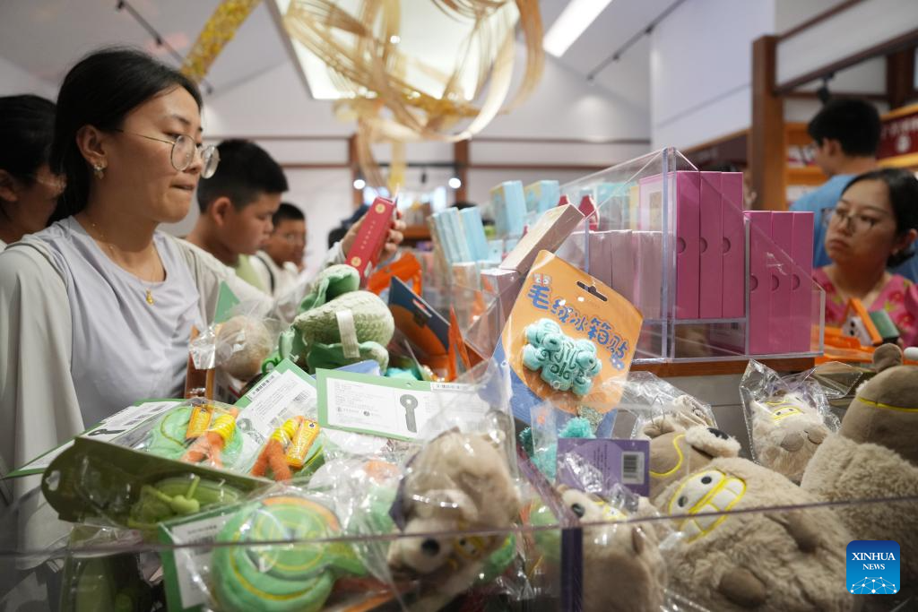 People select cultural and creative products at the Liaoning Provincial Museum in Shenyang, northeast China's Liaoning Province, Aug. 19, 2025. During the summer vacation, cultural sites and museums have become popular destinations for people in northeast China's Heilongjiang, Jilin, Liaoning provinces and north China's Inner Mongolia Autonomous Region. (Xinhua/Li Gang)