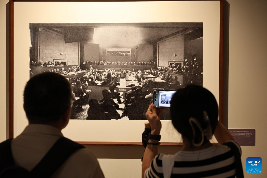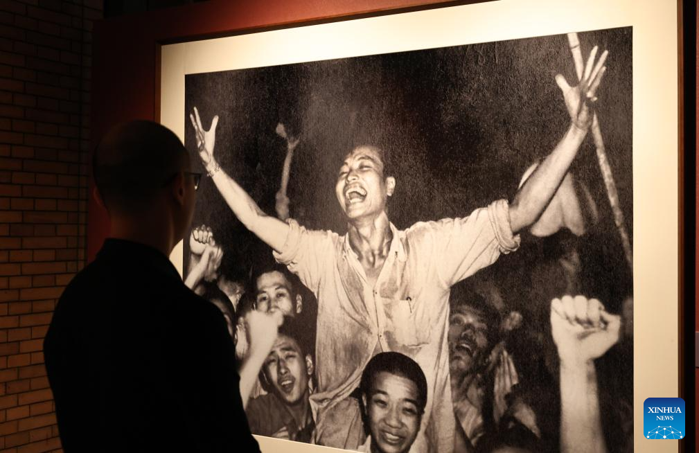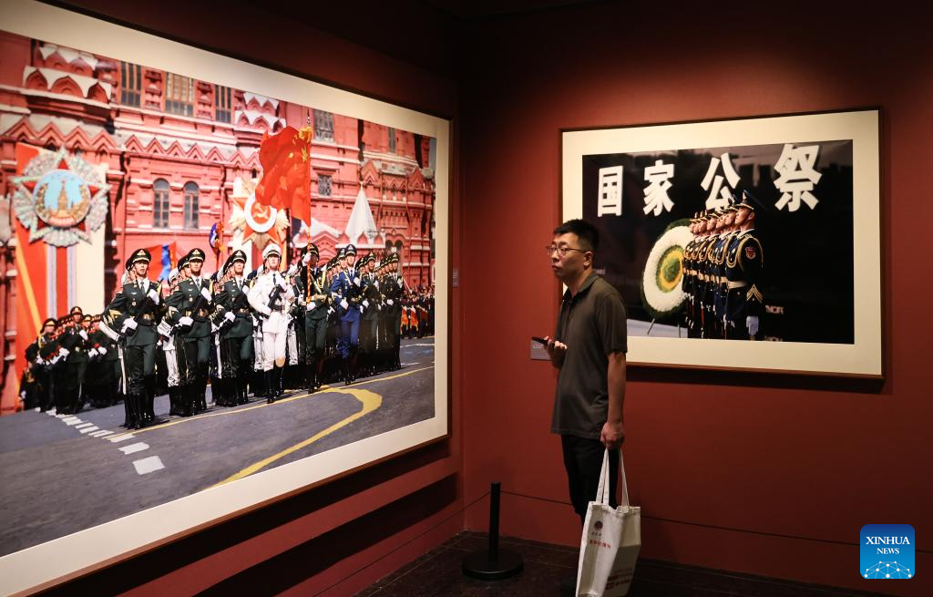 A man visits an art exhibition highlighting the Chinese People's War of Resistance Against Japanese Aggression in east China's Shanghai, Sept. 1, 2025. An art exhibition featuring more than 140 photographs on the Chinese People's War of Resistance Against Japanese Aggression kicked off in Shanghai on Monday. Held by China's national news agency Xinhua, the exhibition is a satellite event to the main display opened in Beijing on Aug. 26. (Xinhua/Fang Zhe)
