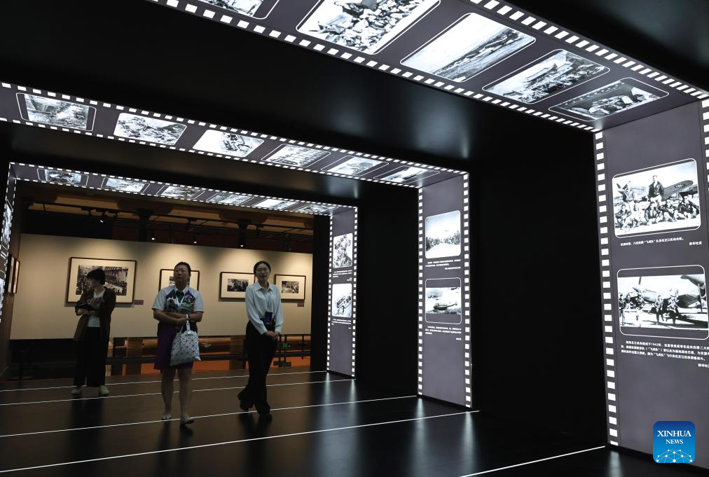 People visit an art exhibition highlighting the Chinese People's War of Resistance Against Japanese Aggression in east China's Shanghai, Sept. 1, 2025. An art exhibition featuring more than 140 photographs on the Chinese People's War of Resistance Against Japanese Aggression kicked off in Shanghai on Monday. Held by China's national news agency Xinhua, the exhibition is a satellite event to the main display opened in Beijing on Aug. 26. (Xinhua/Fang Zhe)