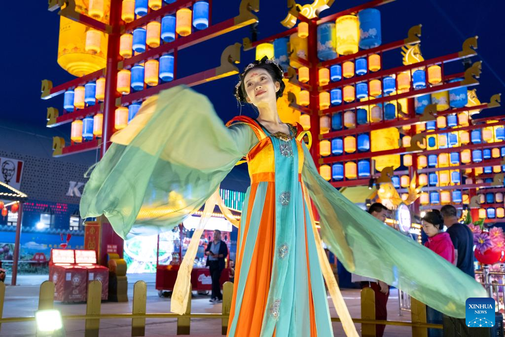 With diversified business formats such as ancient-style performance, specialty food and parent-child entertainment, this theme block at Qahar Right Wing Front Banner of Ulanqab has effectively driven night consumption and become a new engine to promote the development of local night economy. (Xinhua/Ma Jinrui)