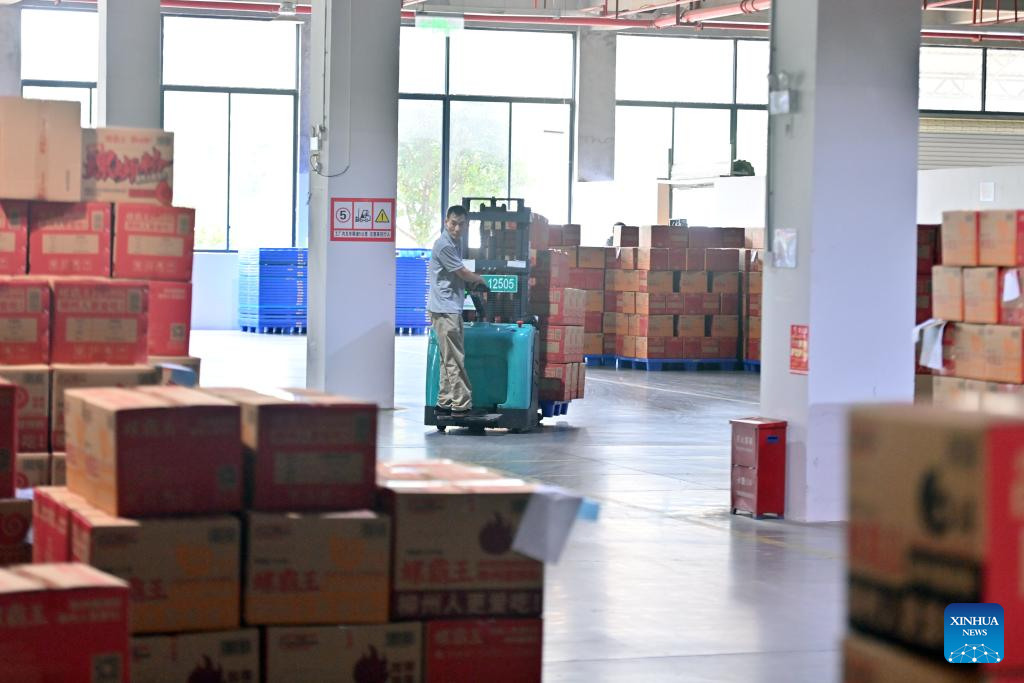 A staff member transports packs of pre-package Luosifen at the warehouse of a company in Liuzhou, south China's Guangxi Zhuang Autonomous Region, Sept. 9, 2025. Luosifen, or river snail rice noodles, drew attention and popularity at the ongoing 22nd China-ASEAN Expo.