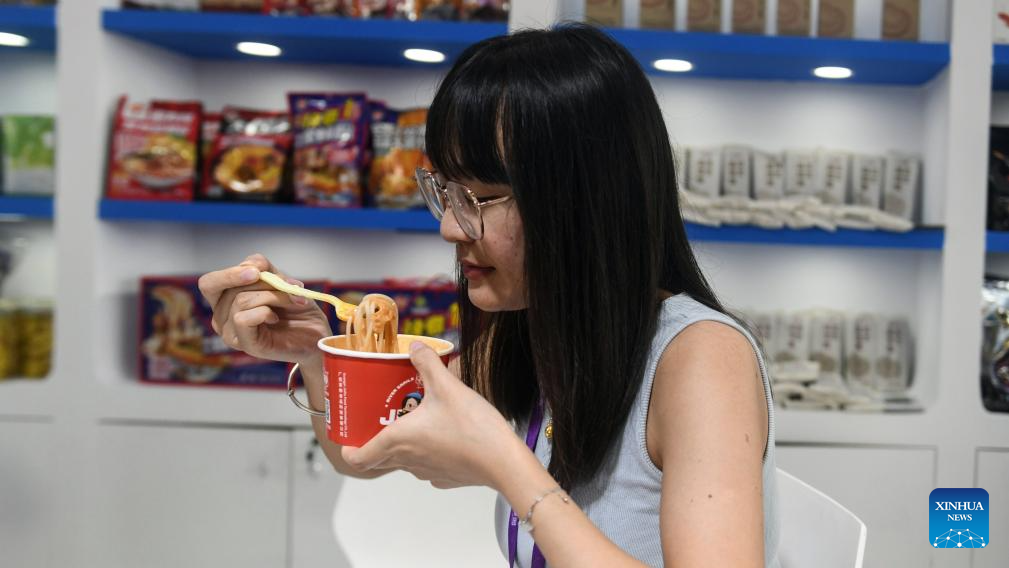 A visitor tastes Luosifen at a booth of the 22nd China-ASEAN Expo in Nanning, south China's Guangxi Zhuang Autonomous Region, Sept. 17, 2025. Luosifen, or river snail rice noodles, drew attention and popularity at the ongoing 22nd China-ASEAN Expo.