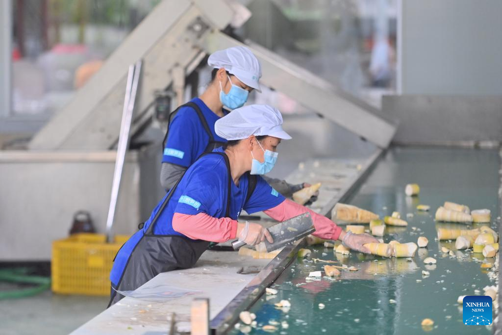 Staff members prepare raw ingredients for pickled bamboo shoots at the workshop of a company in Liuzhou, south China's Guangxi Zhuang Autonomous Region, July 11, 2025. Luosifen, or river snail rice noodles, drew attention and popularity at the ongoing 22nd China-ASEAN Expo.