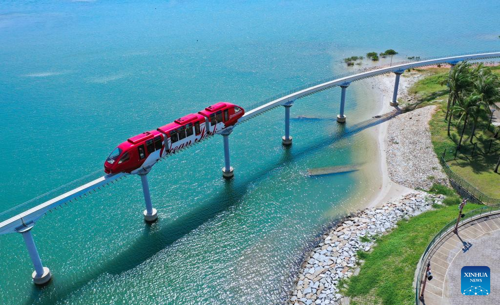An aerial photo shows a mini train running at Hainan Ocean Paradise Resort in Lingshui Li Autonomous County in south China's Hainan Province, Oct. 19, 2025. Many tourists choose to travel off-peak to China's island province of Hainan, a popular tourist destination, as prices of transport and accommodation dip following China's National Day holiday. (Xinhua/Guo Cheng)
