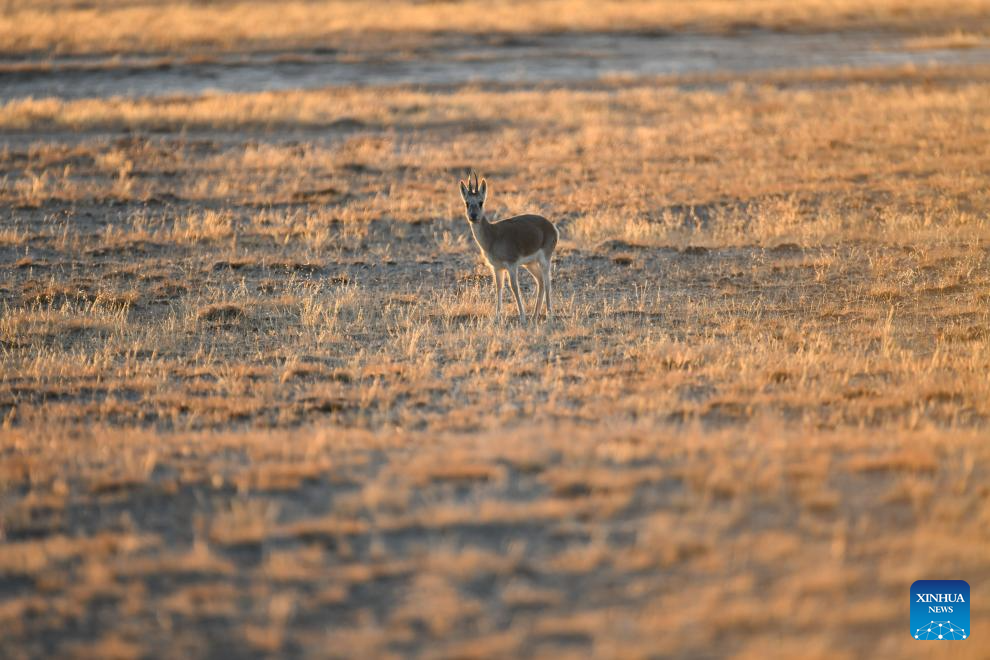 A Tibetan gazelle is pictured on Haltern plateau in Aksai Kazak Autonomous Prefecture of northwest China's Gansu Province, Oct. 21, 2025. (Photo by Gao Hongshan/Xinhua)