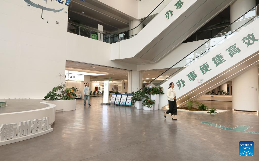 This photo taken on Oct. 26, 2025 shows a service center for government affairs in Quzhou, east China's Zhejiang Province. In recent years, Quzhou has been fostering a harmonious living environment by promoting Chinese etiquette education to the public and putting the idea of "good-mannered" into its governmental service. (Xinhua/Jin Haoyuan)