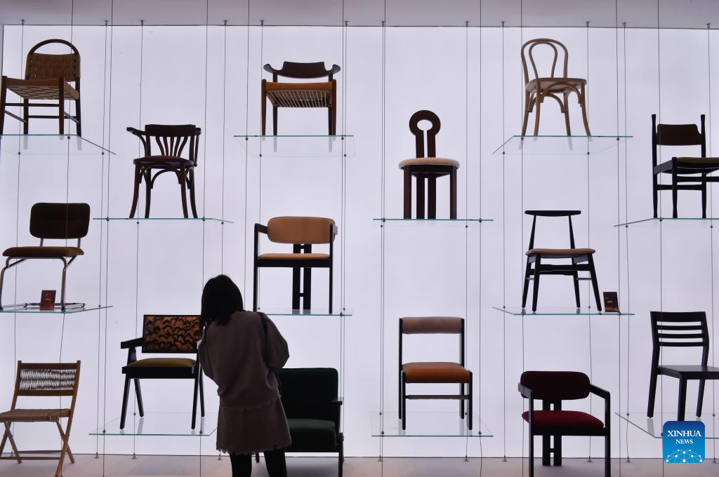 A visitor views chairs at the booth of China's Jiangxi Province during the eighth China International Import Expo (CIIE) in east China's Shanghai, Nov. 6, 2025. The CIIE is not only a global platform for the trade of goods and services but also a grand event for the exchange of cultures and ideas between China and the world. (Xinhua/Lu Peng)