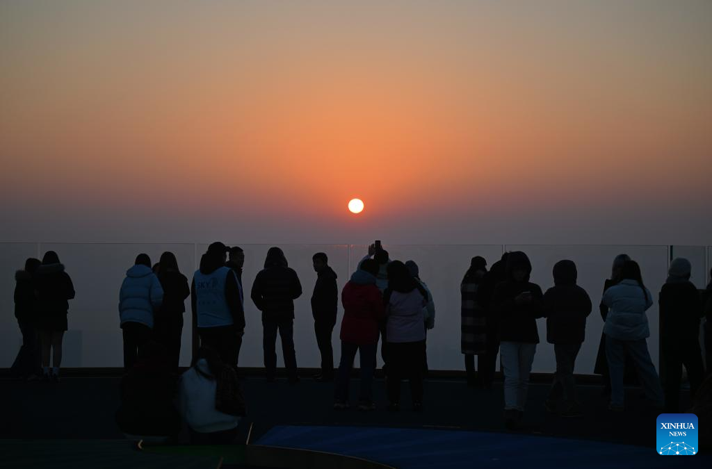 Visitors watch sunset at the Jinwan Yunding sightseeing deck in Heping District of Tianjin, north China on Dec. 17, 2025. Recently, the Jinwan Yunding sightseeing deck, located at the Jinwan Plaza in Heping District of Tianjin, has begun operation. Visitors can ascend to the 300-meter-high rooftop to overlook Tianjin's urban view. (Xinhua/Li Ran)