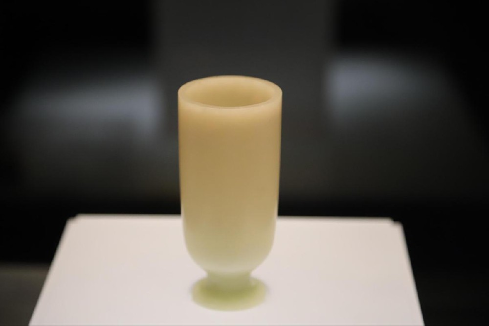 Standing at a height of 13 centimeters with a diameter of 5 centimeters, the white jade artifact features a cylindrical body with a rounded cake-shaped base. Its meticulously carved design reflects the profound influence of the craftsmanship of the Han Dynasty (206 BC-AD 220). With its graceful and smooth curves and unblemished appearance, the cup, which is crafted from the finest Xinjiang Hetian Yangzhi jade, emanates an aura of purity and elegance.