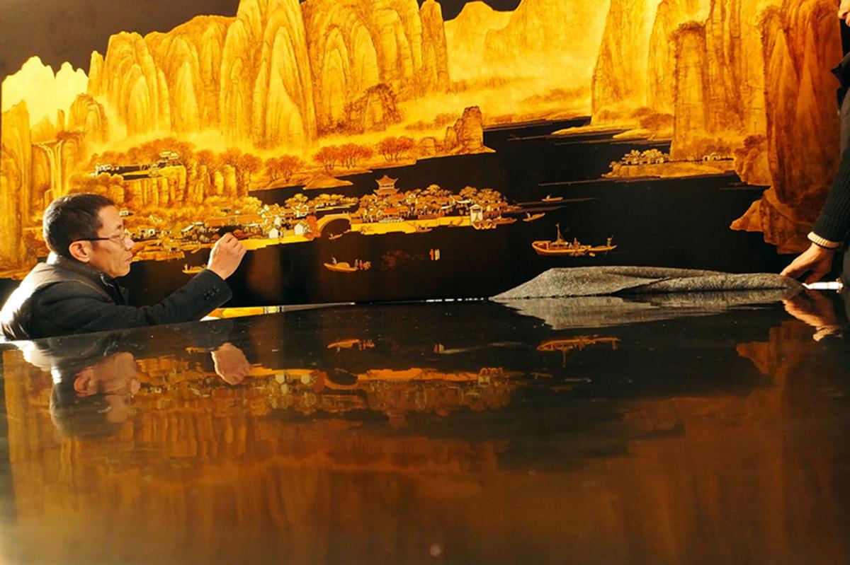 Folk craftsmen in Yiquan village in Xinjiang county of Yuncheng, Shanxi province, create gold-paste artwork. [Photo by Gao Xinsheng/For chinadaily.com.cn]