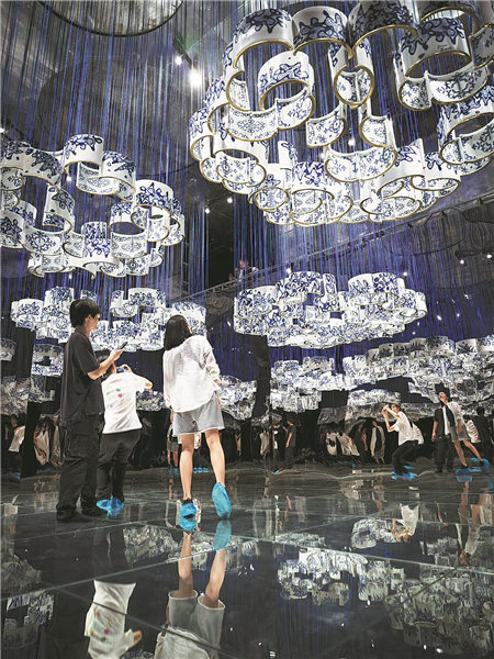 Triple Reflections of Flowers, for example, is a work on display in which dozens of qinghua cobalt blue ceramic tiles are hung in midair and reflected in mirrors that form three walls and the floor.