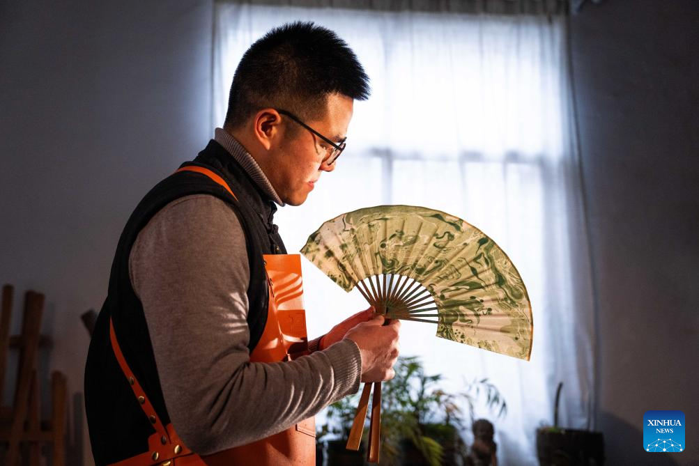 Hao Guanxiong makes lacquer coated fan at his studio in Changsha, central China's Hunan Province, Feb. 28. 2024. Chu-style lacquer coating craft took shape during the Spring and Autumn Period (770 B.C.-476 B.C.) and the Warring States Period (475 B.C.-221 B.C.). Over the past thousands of years, this oriental craft has been mainly used on wood carving artworks and famous for its complicated making, distinguished styles, varied patterns and saturated colors. In 2011, the craft was listed as one of the national-level intangible cultural heritage. (Xinhua/Chen Sihan)