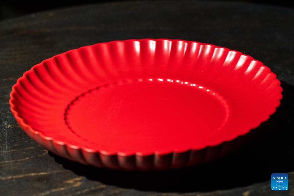 A lacquer coated plate is displayed at Hao Guanxiong's studio in Changsha, central China's Hunan Province, Feb. 28. 2024. Chu-style lacquer coating craft took shape during the Spring and Autumn Period (770 B.C.-476 B.C.) and the Warring States Period (475 B.C.-221 B.C.). Over the past thousands of years, this oriental craft has been mainly used on wood carving artworks and famous for its complicated making, distinguished styles, varied patterns and saturated colors. In 2011, the craft was listed as one of the national-level intangible cultural heritage.(Xinhua/Chen Sihan)