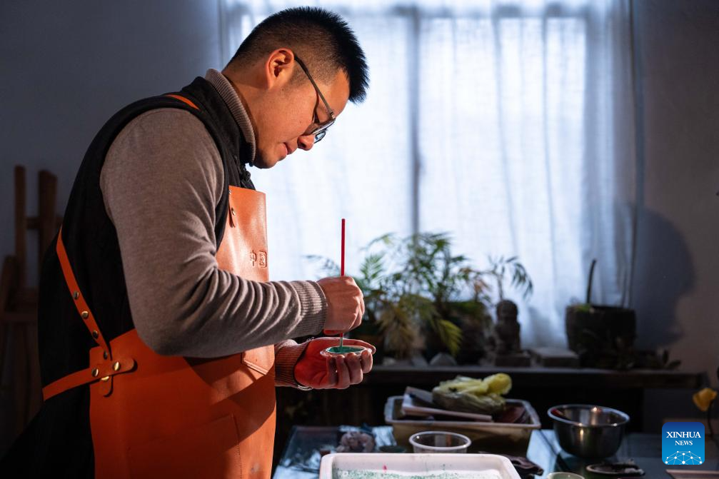 Hao Guanxiong makes an artwork at his studio in Changsha, central China's Hunan Province, Feb. 28. 2024. Chu-style lacquer coating craft took shape during the Spring and Autumn Period (770 B.C.-476 B.C.) and the Warring States Period (475 B.C.-221 B.C.). Over the past thousands of years, this oriental craft has been mainly used on wood carving artworks and famous for its complicated making, distinguished styles, varied patterns and saturated colors. In 2011, the craft was listed as one of the national-level intangible cultural heritage. (Xinhua/Chen Sihan)