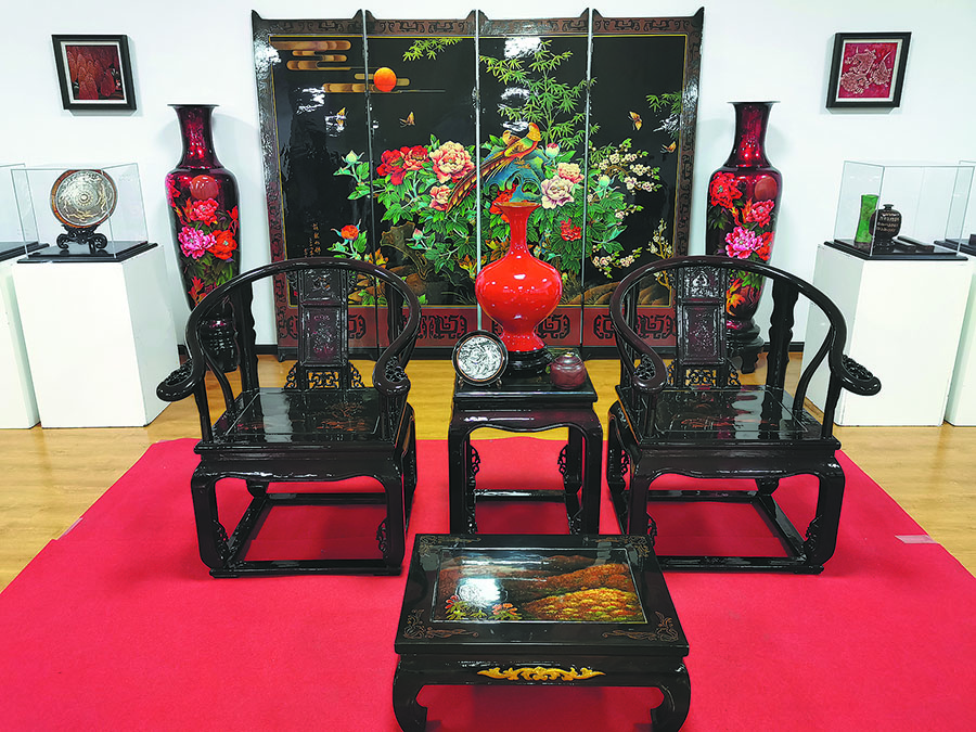 A collection of lacquered furniture at Gao Guangyou's workshop in Bijie city, Guizhou province. [PHOTO BY PENG YOULIN/CHINA DAILY]