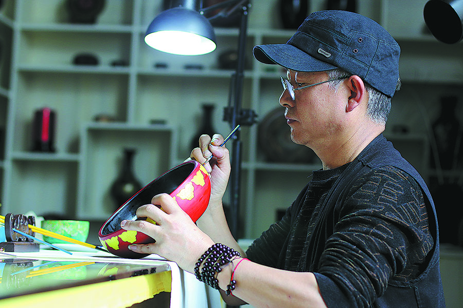 Gao embellishes the lacquerware with paint. [PHOTO BY PENG YOULIN/CHINA DAILY]
