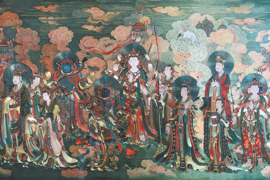 A group portrait of Buddhist deities, several meters in length, is based on a mural and made by Zhang Fan's team using more than 20 stitching techniques of Su embroidery. [Photo provided to China Daily]