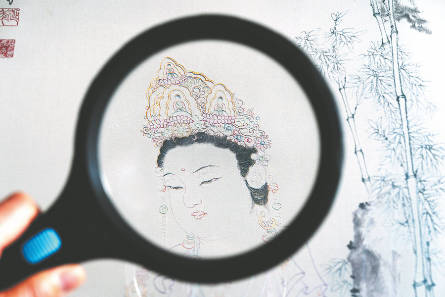 Details of a Buddha embroidery work at Zou Yingzi's studio can only be seen clearly with a magnifying glass. [Photo by Gao Erqiang/China Daily]