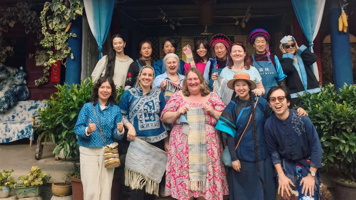 Duan Yiran poses with tourists from the UK and local artisans in Dali city, Southwest China's Yunnan province, during a trip she organized in March to showcase the Bai ethnic group's handicrafts. [Photo provided to China Daily]
