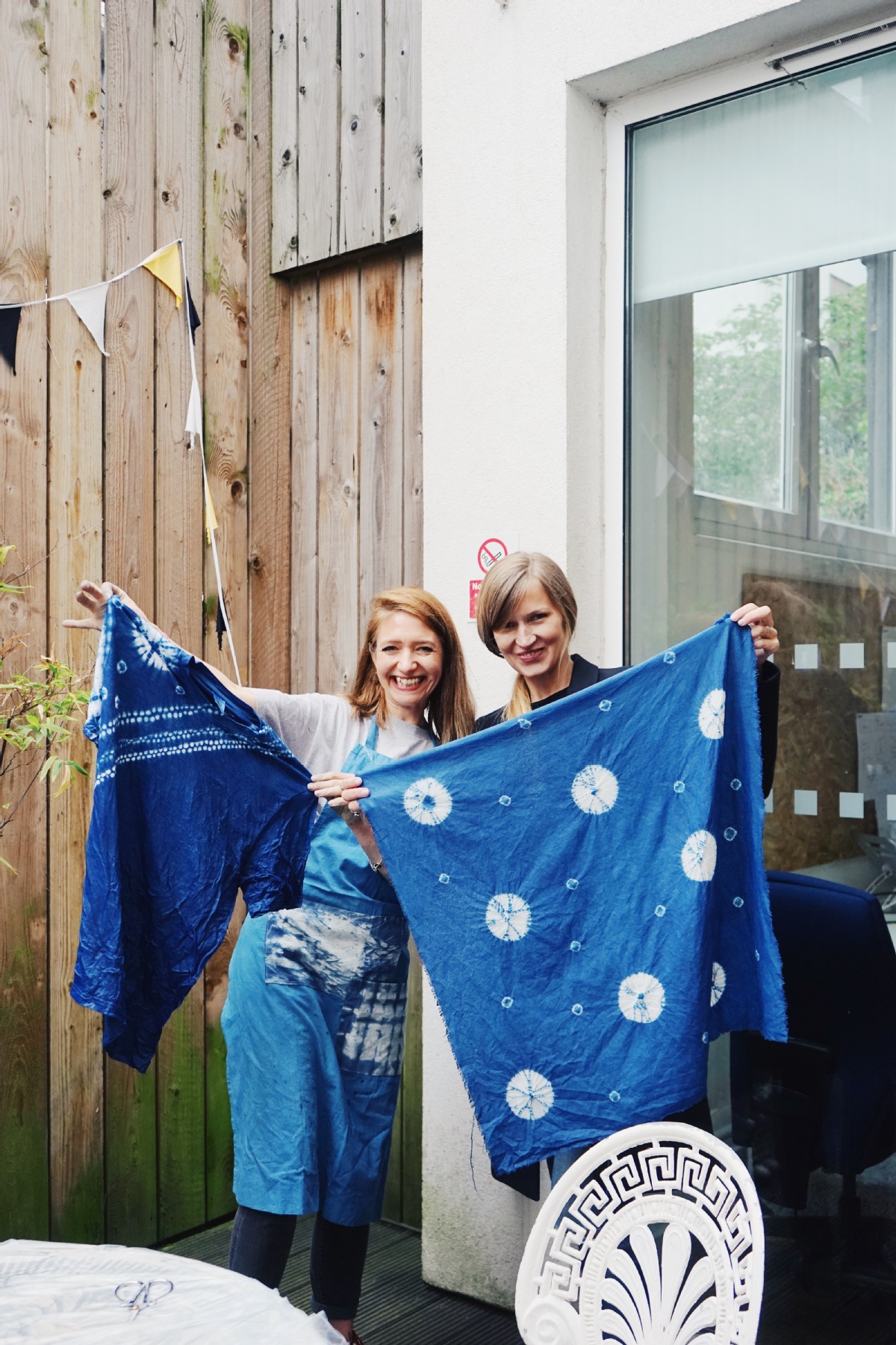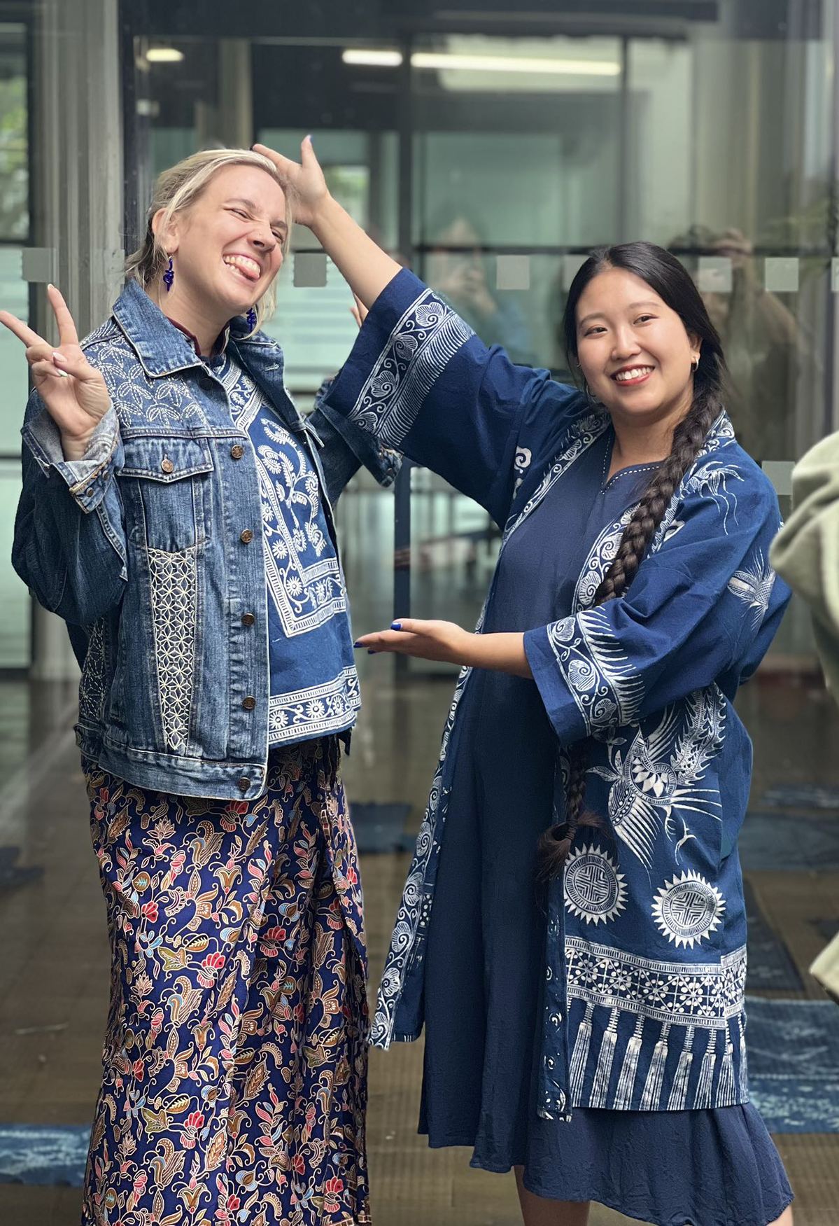 Two participants at one of Duan's tie-dyeing workshops pose with completed work in London in March 2023. [Photo provided to China Daily]