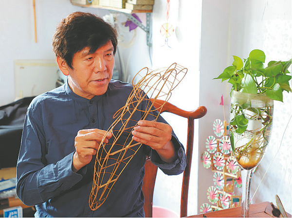 Yang Hongwei, 58, is an inheritor of kite-making techniques in Weifang, Shandong province. CHINA DAILY