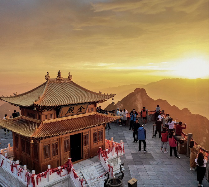 After the sun has arisen, the surroundings on the peak become more visible and defined. In the middle of the platform is a majestic gilded hall that attracts visitors’ attention. This hall, featuring elaborate carvings and paintings and traditional Chinese architectural styles, is the Yuhuang Pavilion. This building was expanded and remodeled on the basis of the original Yuhuang Pavilion, with an area of 246 square meters. It is an octagonal hall and inside it sits a magnificent golden figure dedicated to the Jade Emperor (Yuhuang. There is a huge rock adjacent to the golden pavilion, inscribed with characters alluding to it being one of the highest points in central China. The altitude of the summit is marked below. From here, visitors can enjoy a panoramic view of the Yuhuang Peak.