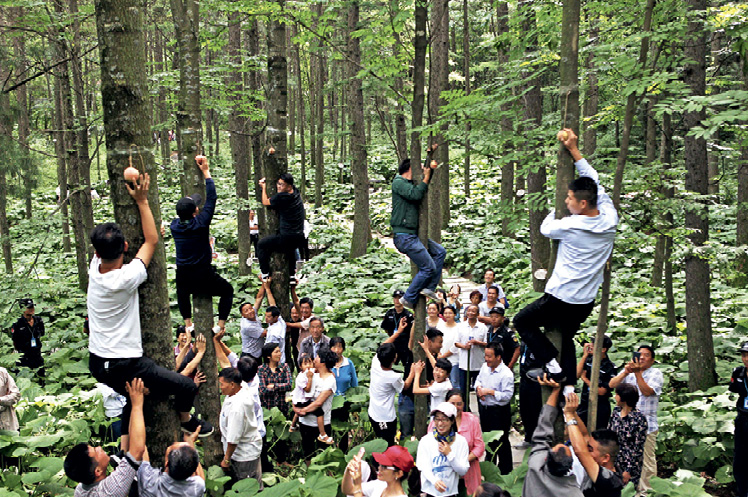 A tree climbing race is taking place in the ancient forest of Baiyun Mountain on August 11, 2017.