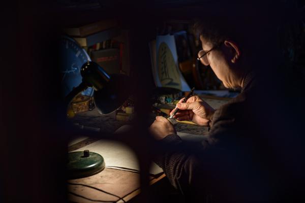 Su Donghe carves a seal with a knife. (Photo/CCTV News)