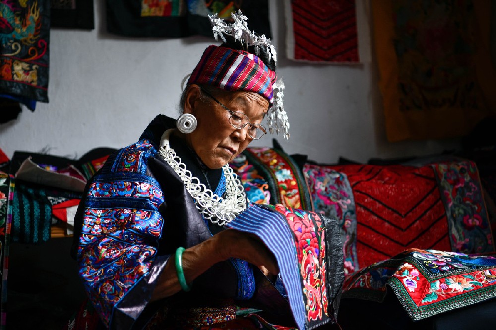Pan Yuzhen is an inheritor of the intangible cultural heritage of Miao embroidery of the Miao ethnic group.[Photo/Xinhua]