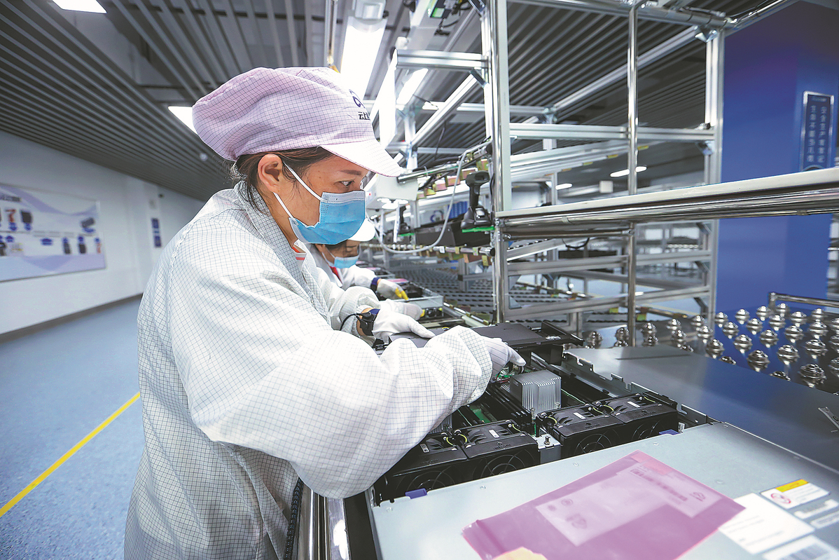 An employee works on an assembly line of Guizhou Yunshang Kunpeng Technology in Gui'an New Area. CHINA DAILY