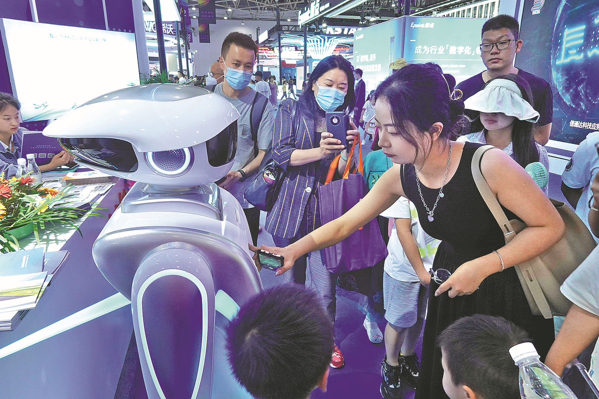 Attendees at the data expo in Guiyang interact with a robot on May 27. QIN GANG/FOR CHINA DAILY