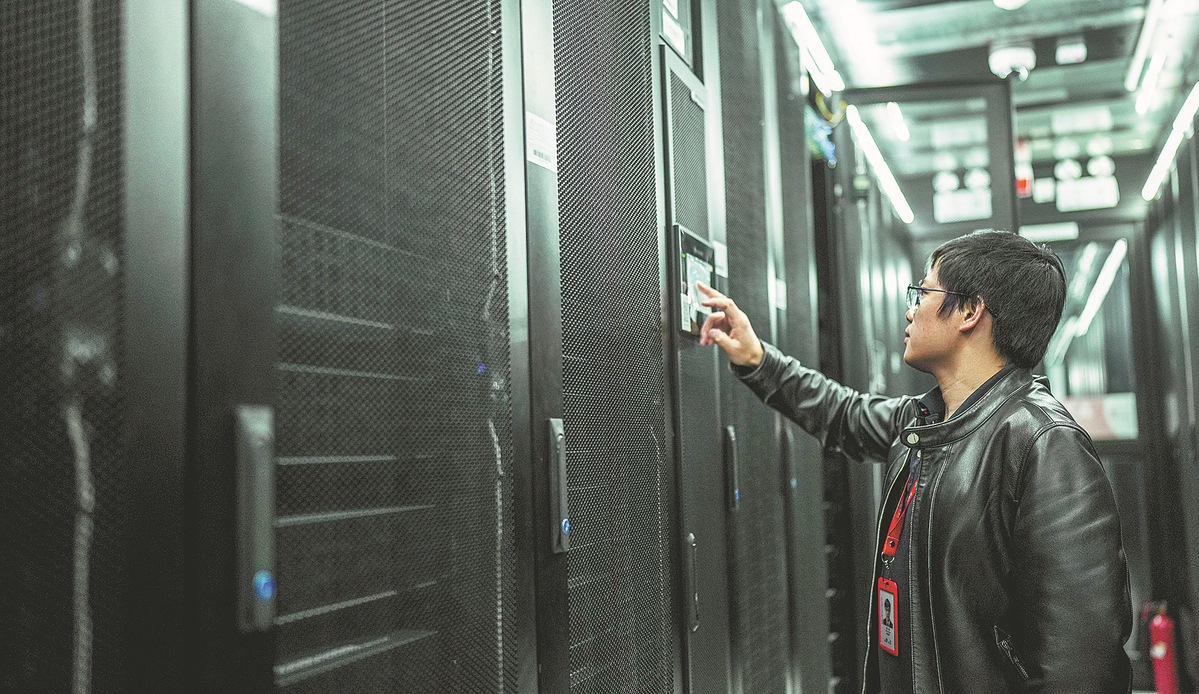 A tech engineer checks the status of computing devices at a cloud data center owned by China Telecom in Gui'an New Area on May 23. TAO LIANG/FOR CHINA DAILY