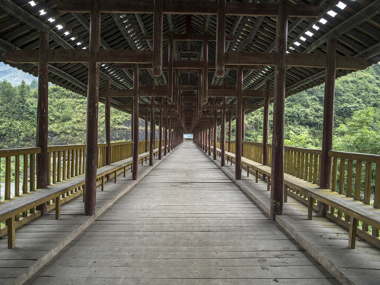 Chinese people have a fondness for ancient trees, considering them to be like hale and hearty old men, as well as symbols of wisdom and longevity. This covered bridge is named after sweetgum tree, since the town where it is located is famous for its hundreds of old sweetgum trees. These strong and lofty trees are more than 400 years old, all treasured and well-preserved by the local villagers. Among these lush old trees quietly stands a small wooden bridge, with a perfectly symmetric view in your eyes when you stand on the bridge.