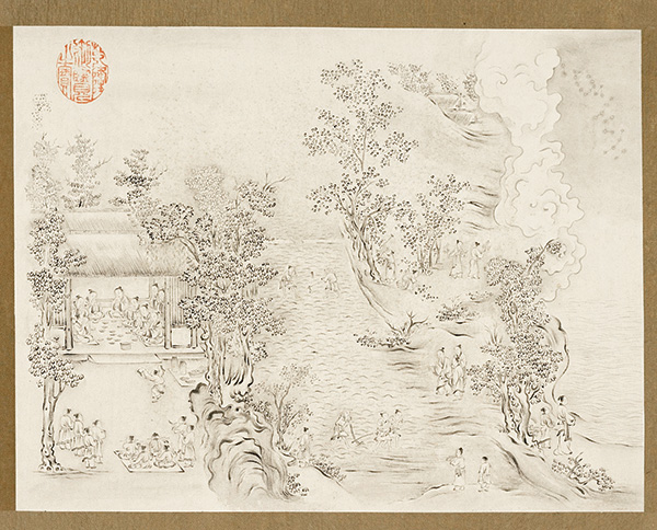 Among these different renditions is one that captures the gist of the poem — the longest of all folk poem-songs contained in Shi Jing. It starts with two stargazers in the far right corner, continues with some plowing and the picking of mulberry leaves, before ending with a refined scene of gentlemen gathering under a thatched roof.