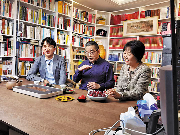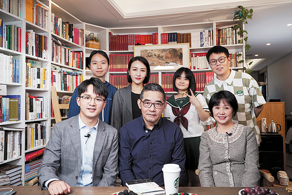 Zhao Jian (left, front) poses with author Su Tong (center, front), scholar Huang Han (right, front) and his team members after a livestreaming session.[Photo provided to China Daily]