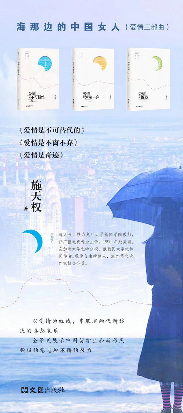 The trilogy titled All About Love: the woman on the Other Side of the Sea consists of Love Is Irreplaceable, Love Is Perseverant and Love Is Magic. Each book tells a different story of the struggle to succeed in the US in the 1990s, presenting a panoramic overview of how the women triumphed at a time when Chinese students and scholars were flooding into the US.