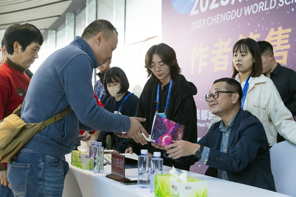 Liu Cixin returns an autographed book to a fan at the 81st World Science Fiction Convention, a five-day event that closed in Chengdu, Sichuan province, on Sunday. [Photo/Xinhua]